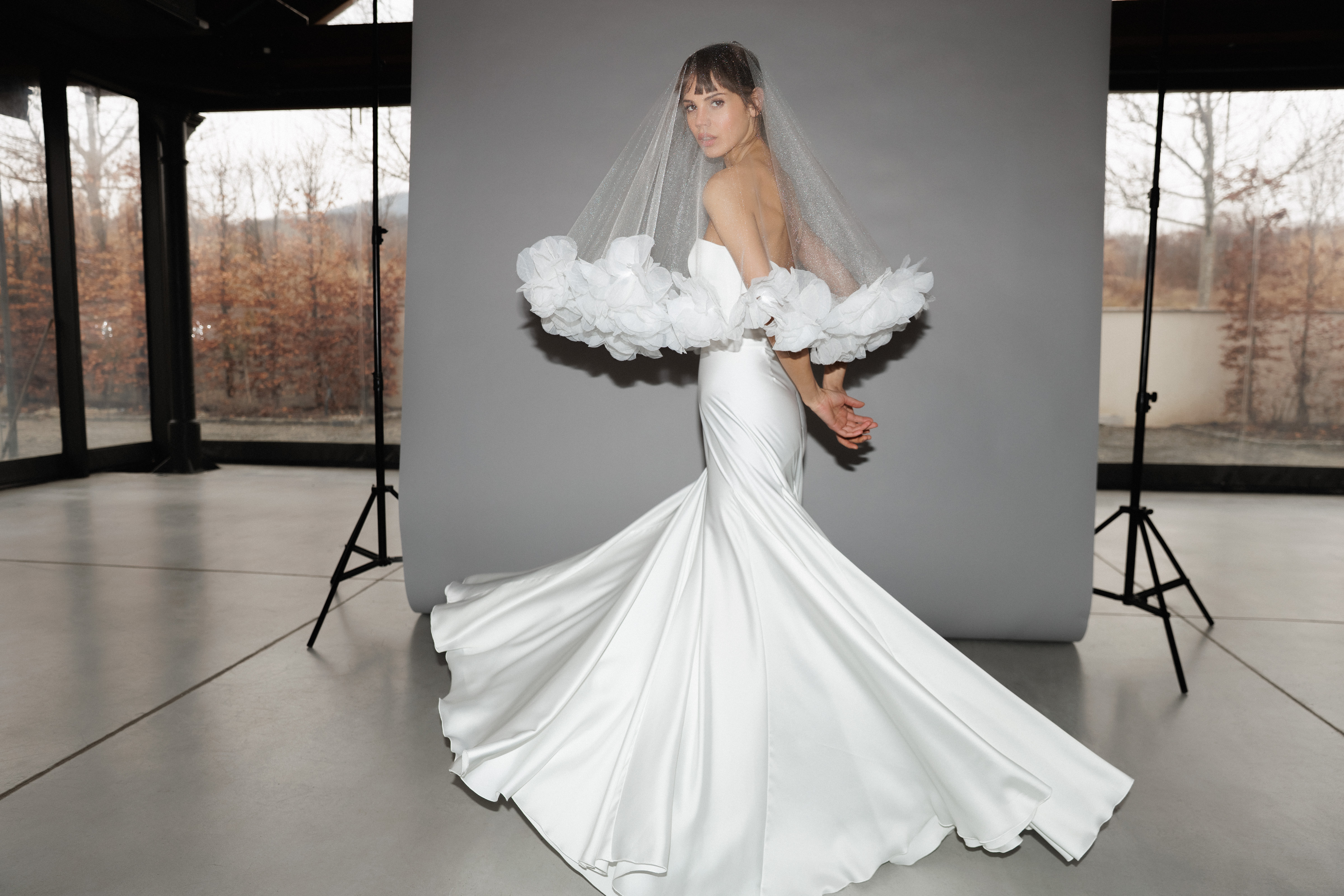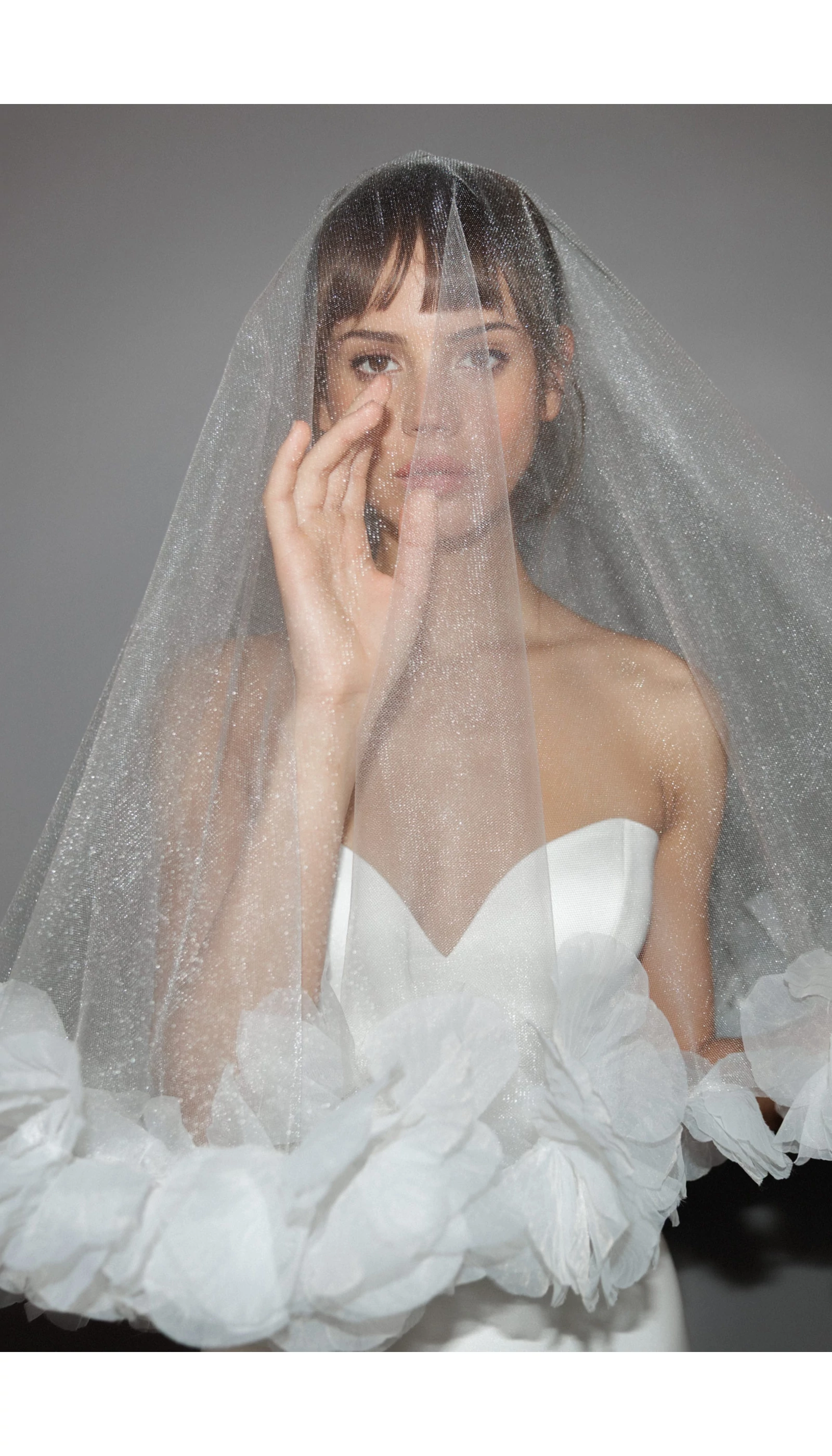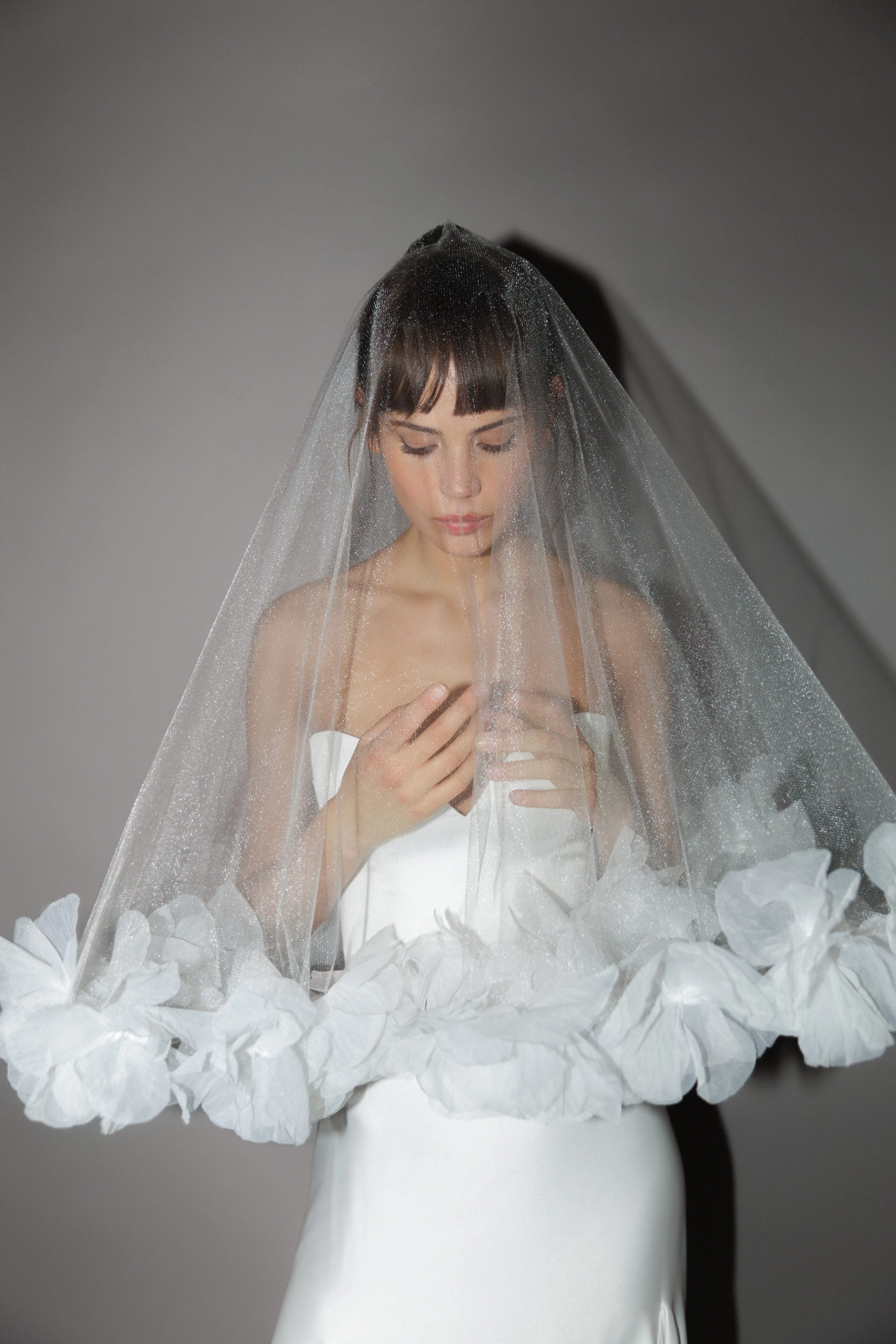 finoman csillogó kristálytüllből készült, amely elegáns és kifinomult megjelenést biztosít. A törtfehér szín és a háromdimenziós virágok romantikus, mégis modern hatást keltenek. A fátyol hossza 140 cm, így ideális választás, ha egy letisztult, de különleges kiegészítőt keresel az esküvődhöz.