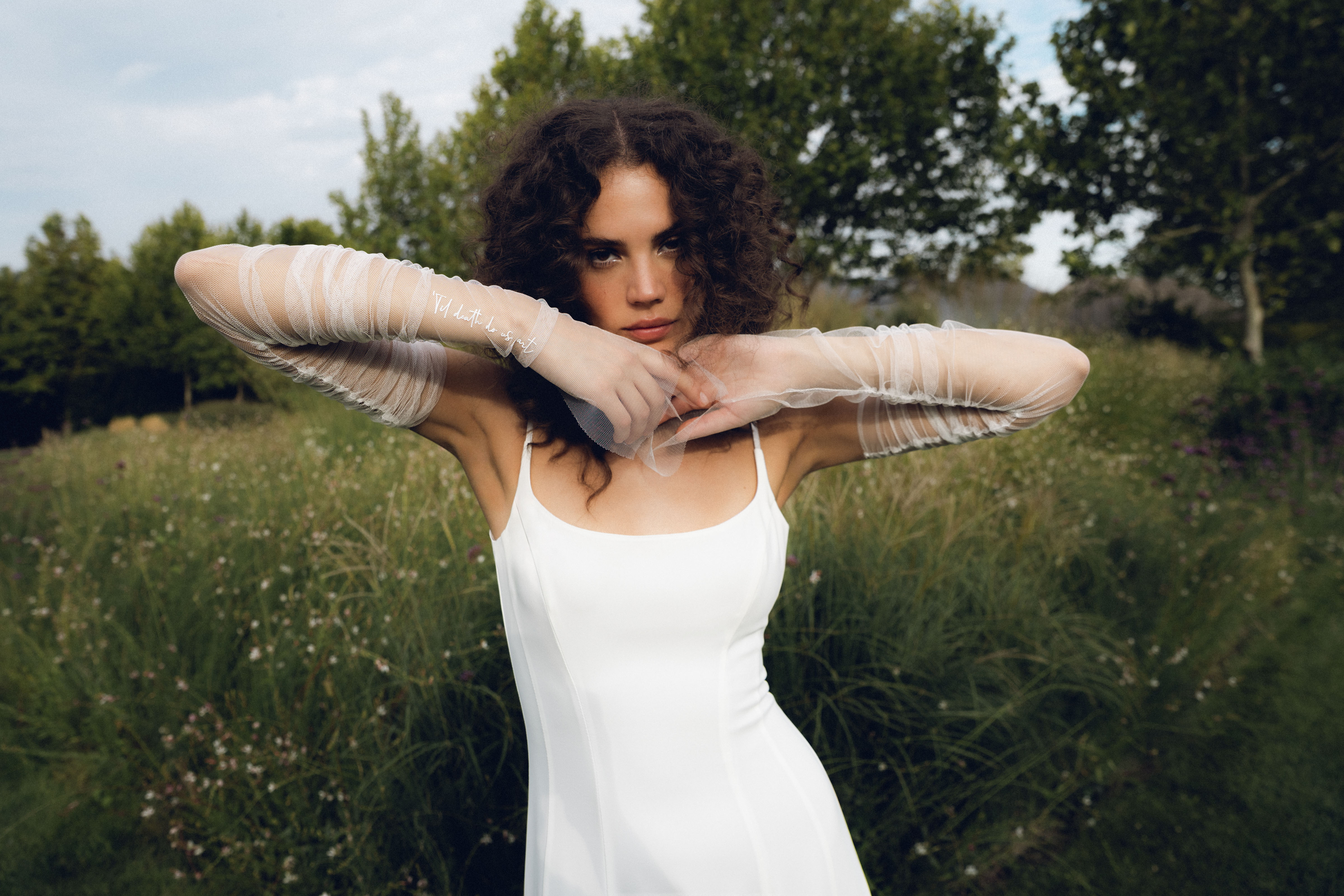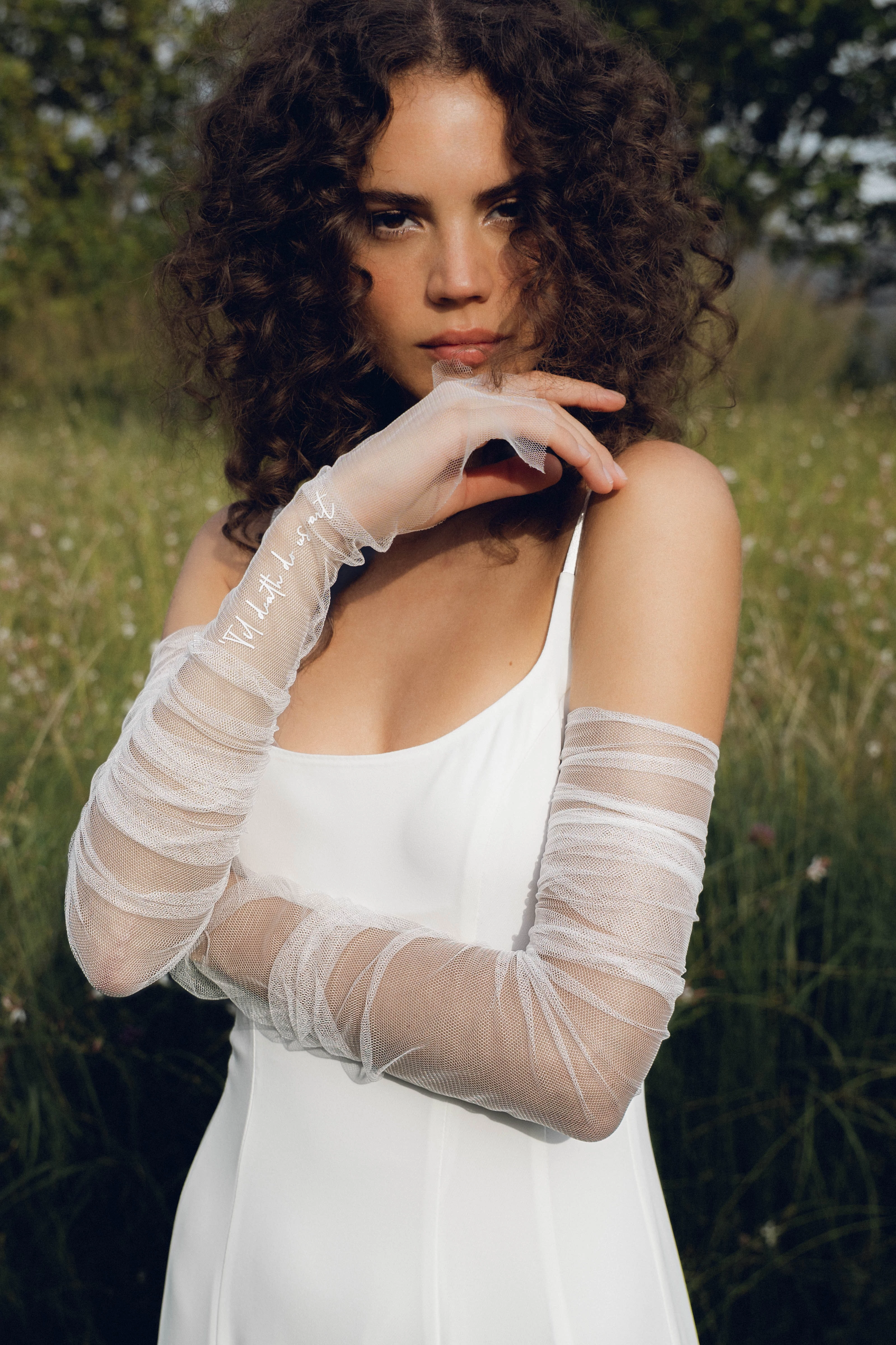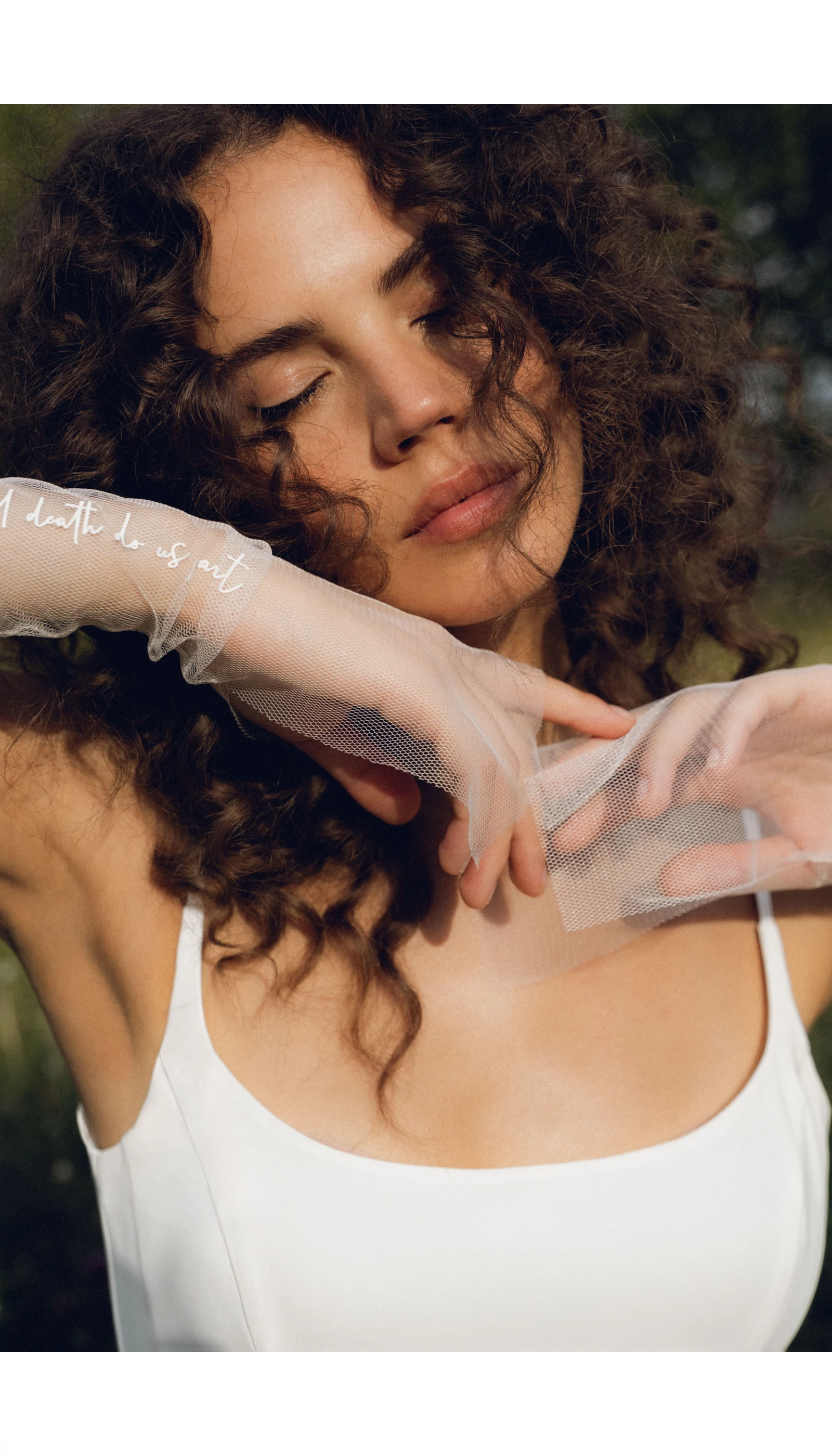 Egy elegáns, tüllből készült kesztyű, mely tökéletes kiegészítője lehet bármilyen különleges alkalomnak.