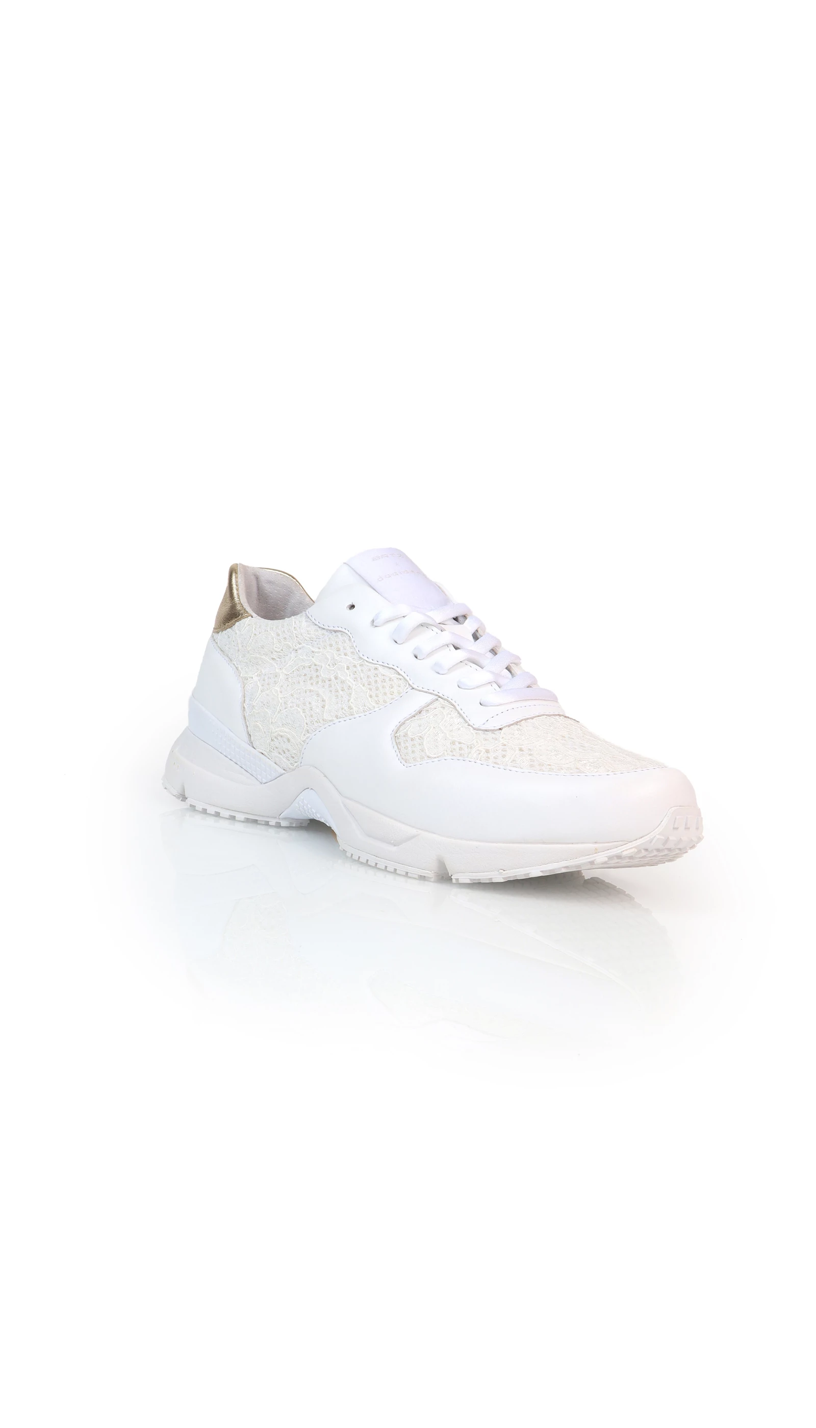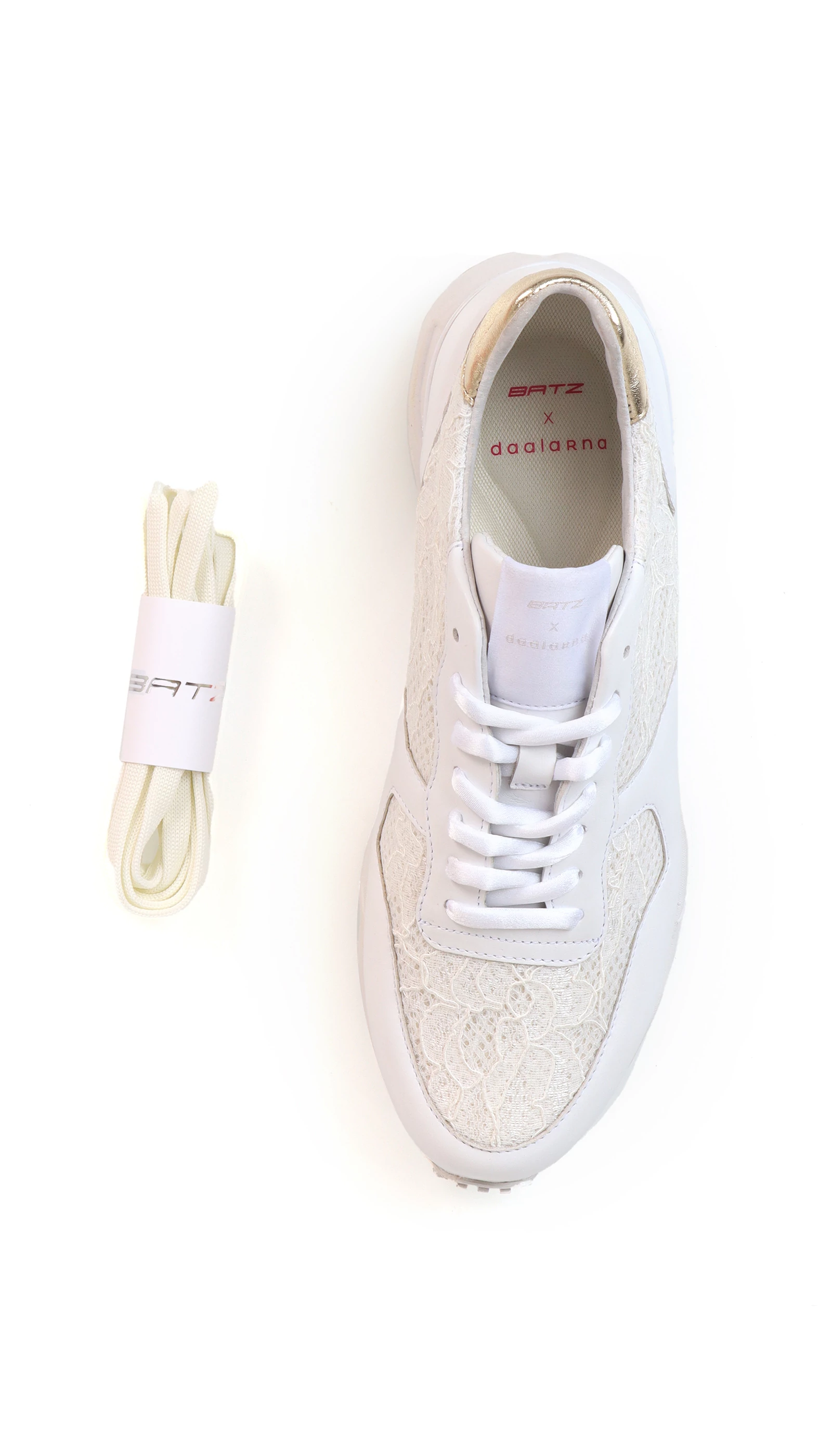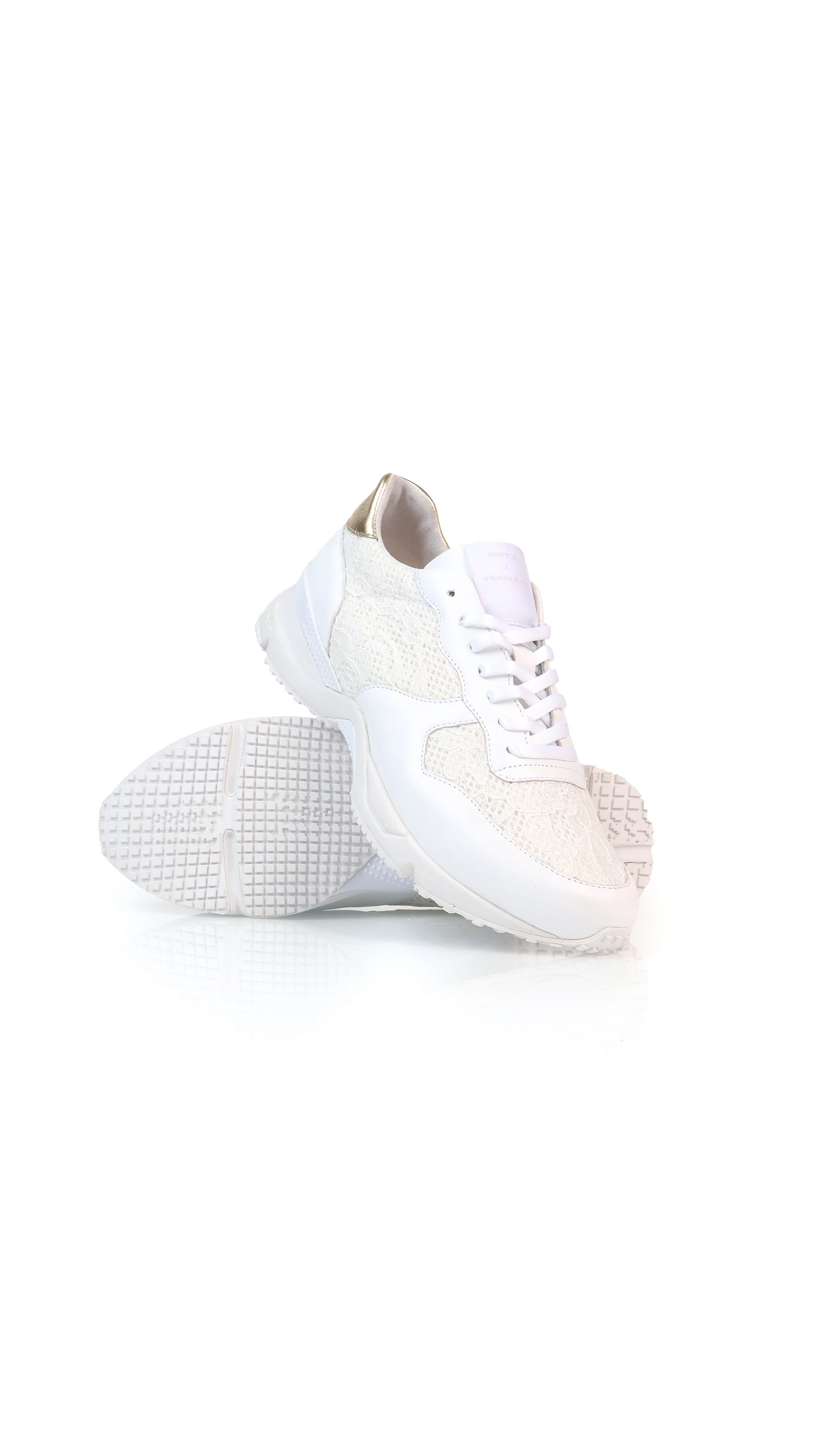 Egy sneaker azoknak, akik egy jól kombinálható, mégis egyedi cipőre vágynak. Ezt a csipkebetétekkel díszített, törtfehér bőr cipőt a sarkán arany metálos bőrrel tettük még különlegesebbé. Hogy ne legyen túl sok az összhatás, egy finomabb, nőiesebb talppal kombináltuk. A tervezésnél a fő szempontok közé tartozott, hogy olyan anyagok legyenek felhasználva a cipő kialakítása során, amelyek nem csak tartósak, de passzolnak akár egy törtfehér színű esküvői vagy alkalmi ruhához is.