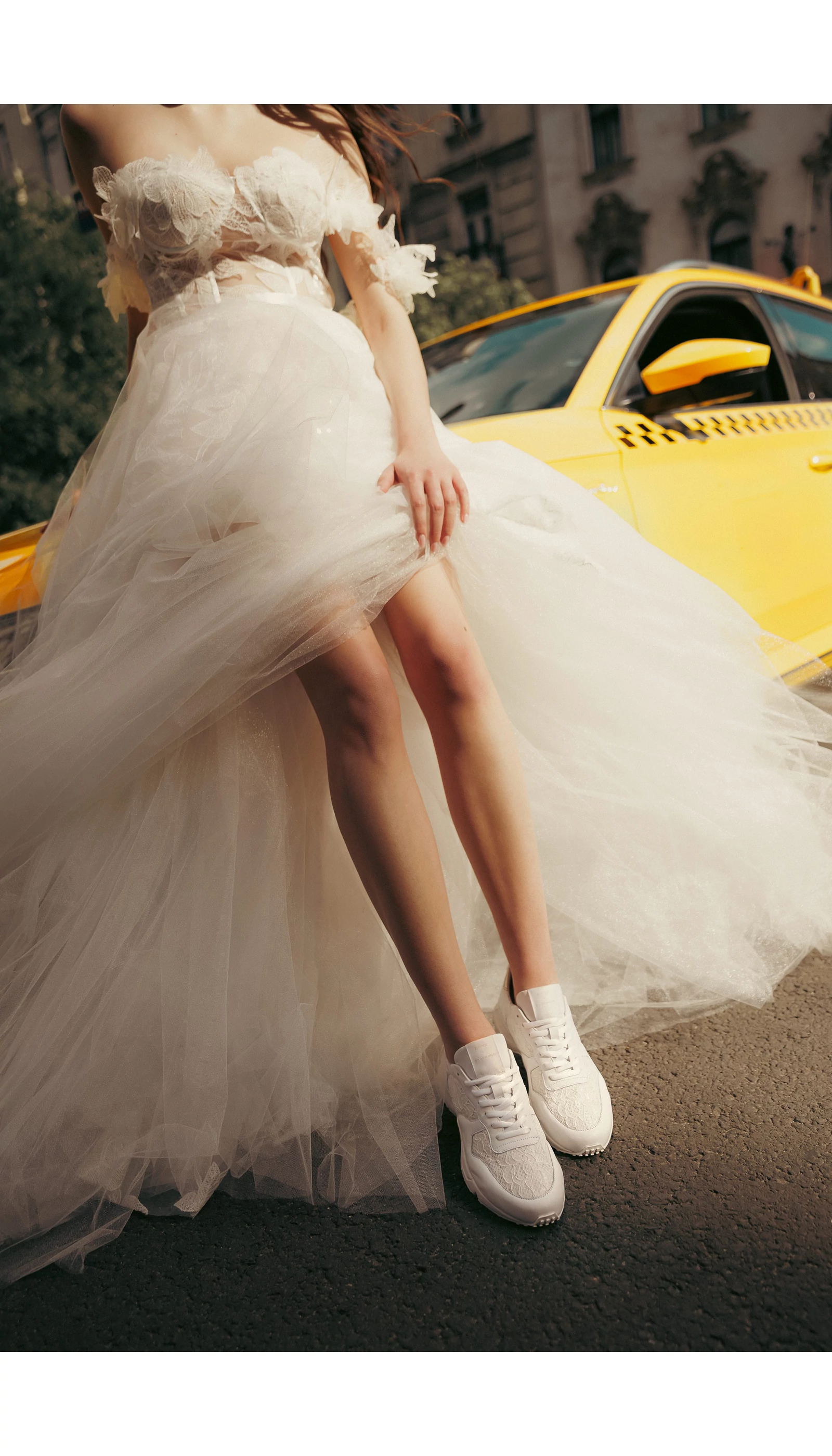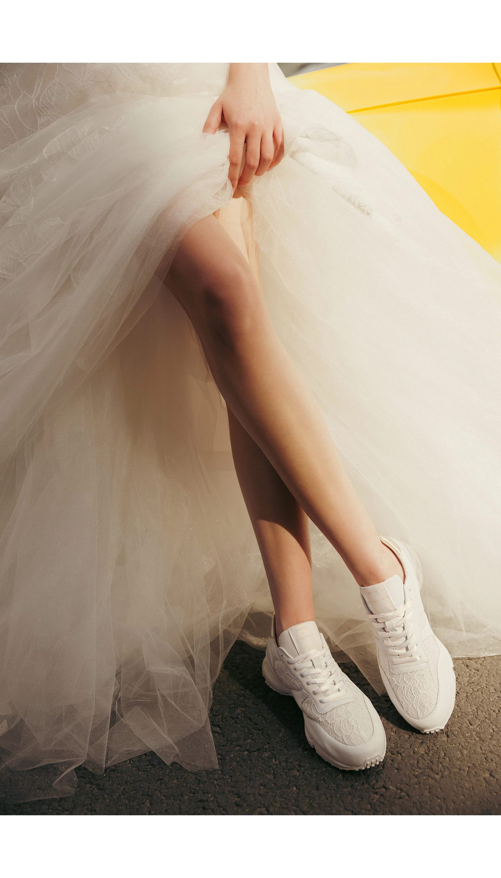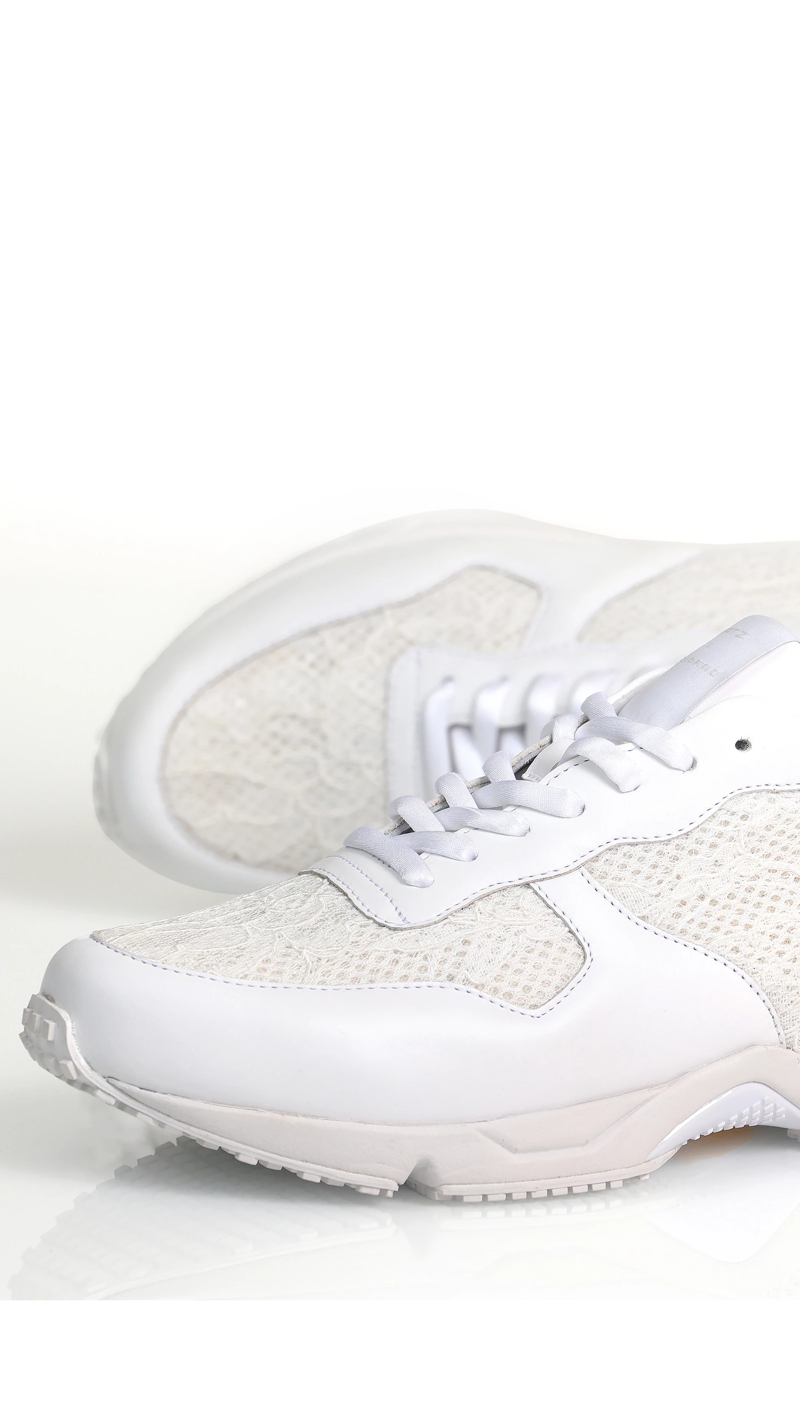 Egy sneaker azoknak, akik egy jól kombinálható, mégis egyedi cipőre vágynak. Ezt a csipkebetétekkel díszített, törtfehér bőr cipőt a sarkán arany metálos bőrrel tettük még különlegesebbé. Hogy ne legyen túl sok az összhatás, egy finomabb, nőiesebb talppal kombináltuk. A tervezésnél a fő szempontok közé tartozott, hogy olyan anyagok legyenek felhasználva a cipő kialakítása során, amelyek nem csak tartósak, de passzolnak akár egy törtfehér színű esküvői vagy alkalmi ruhához is.