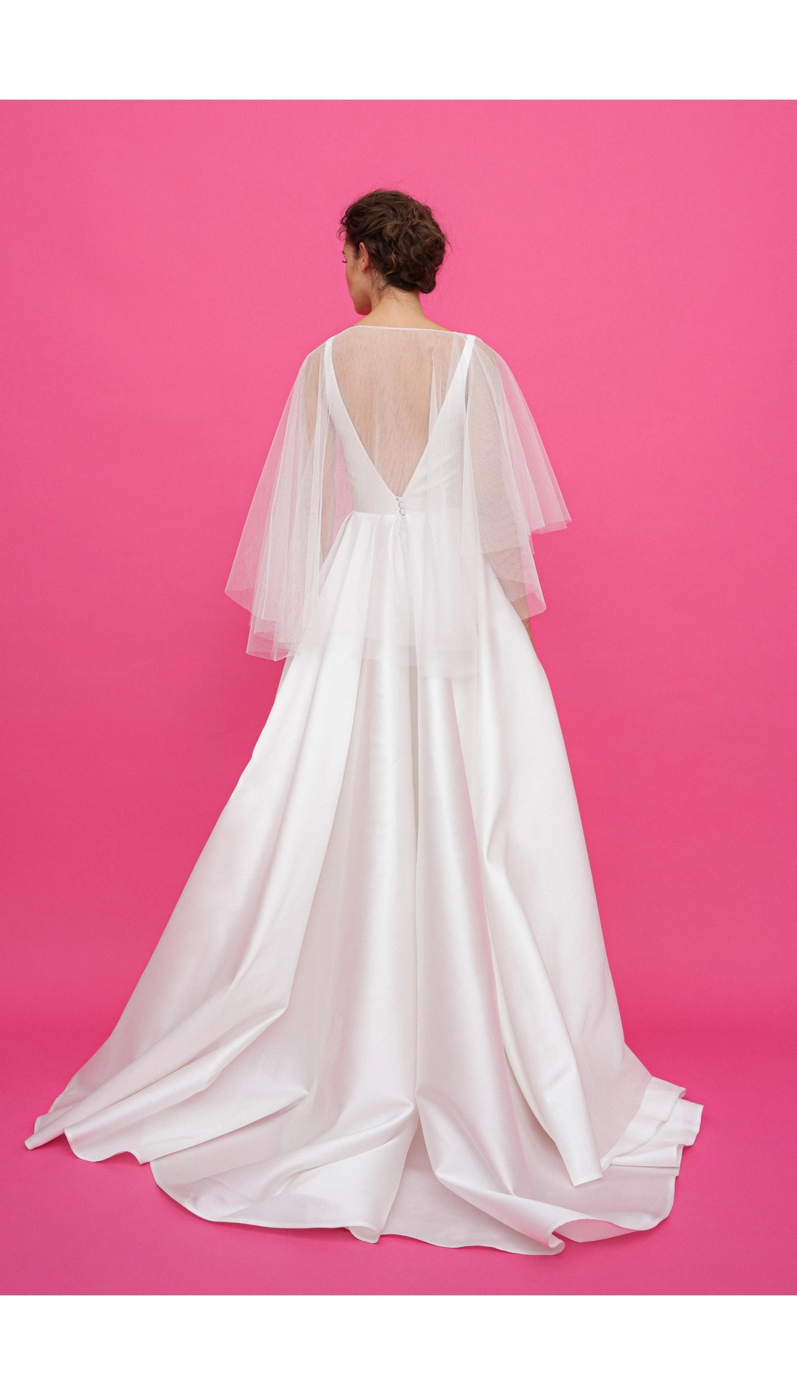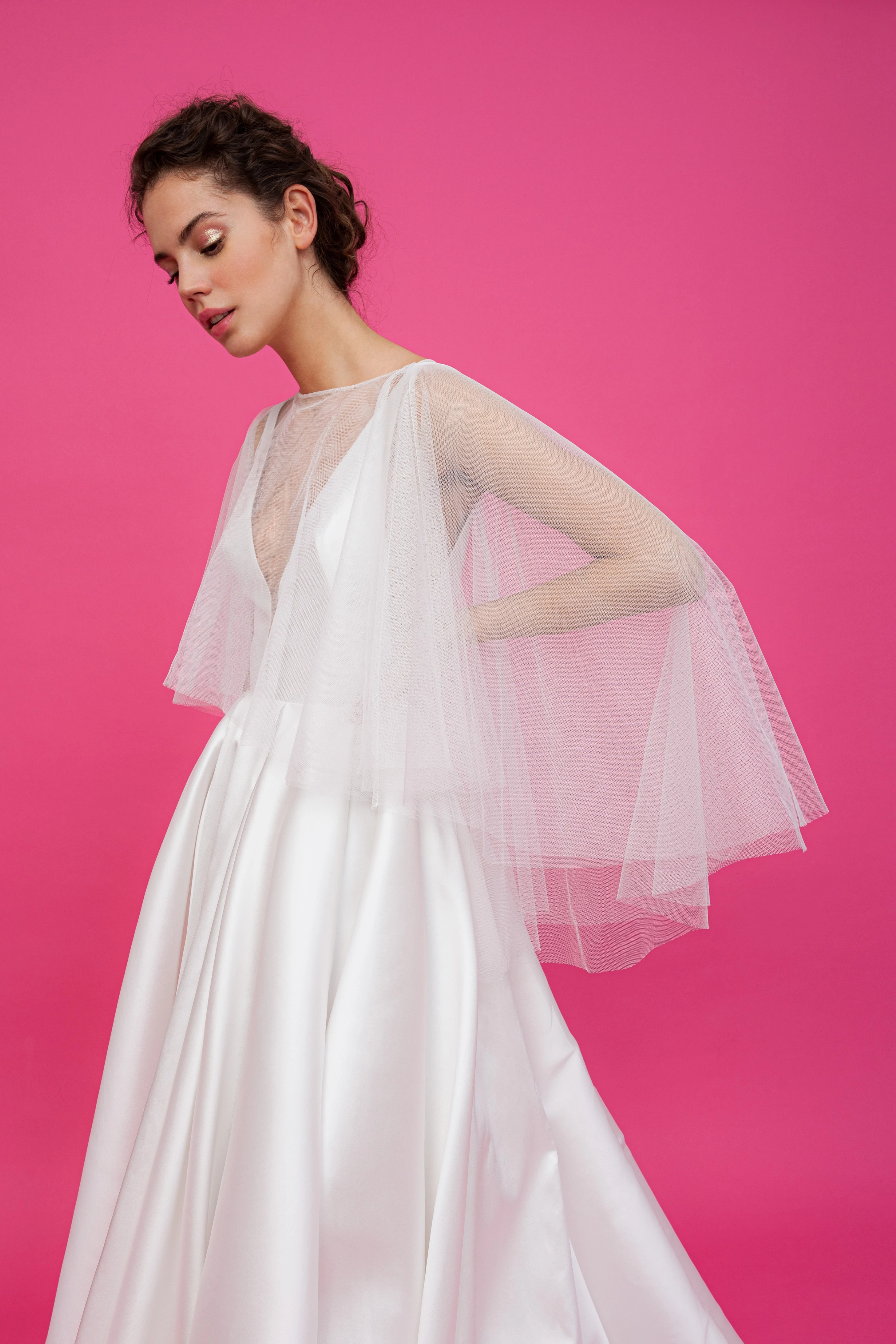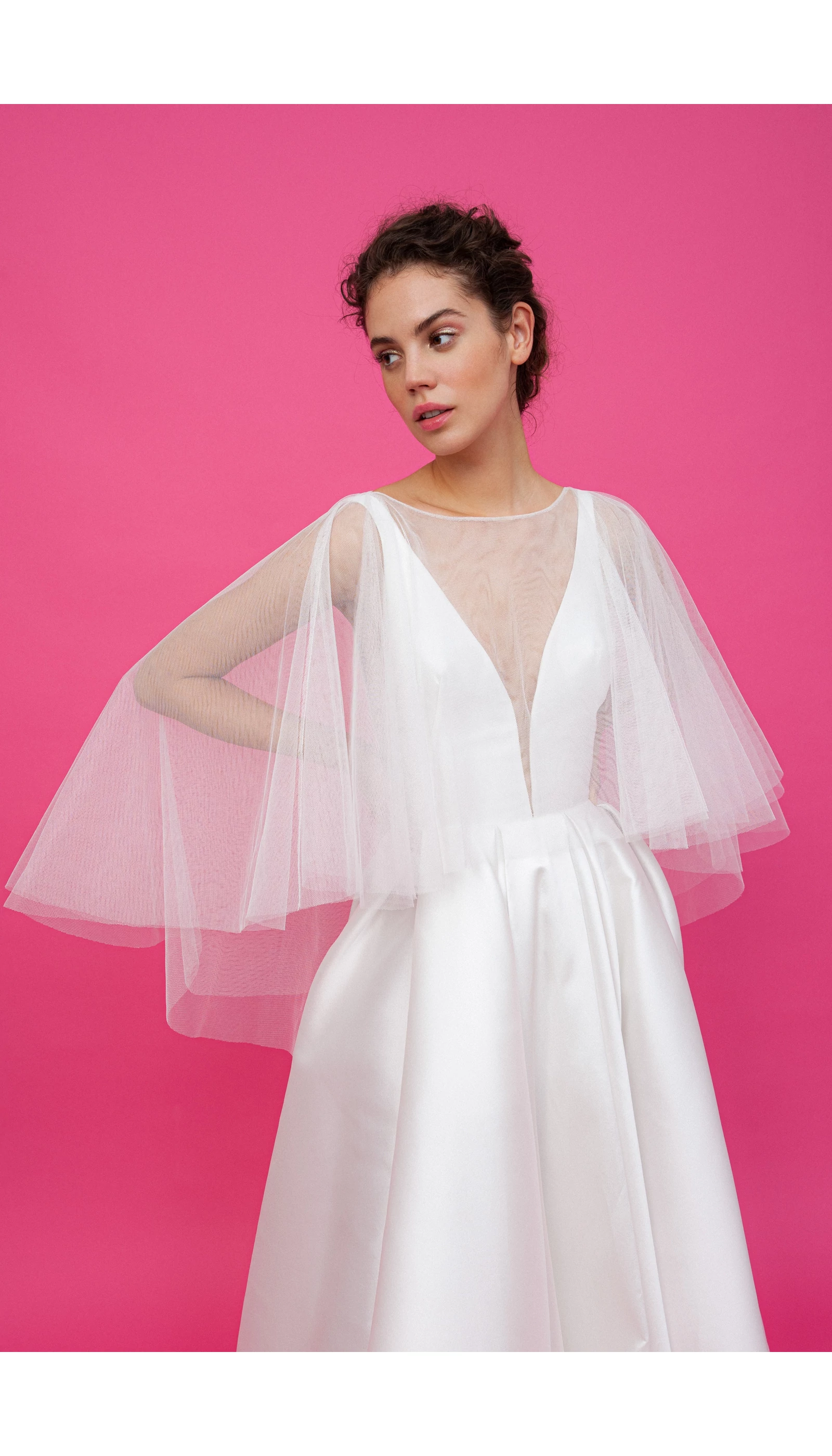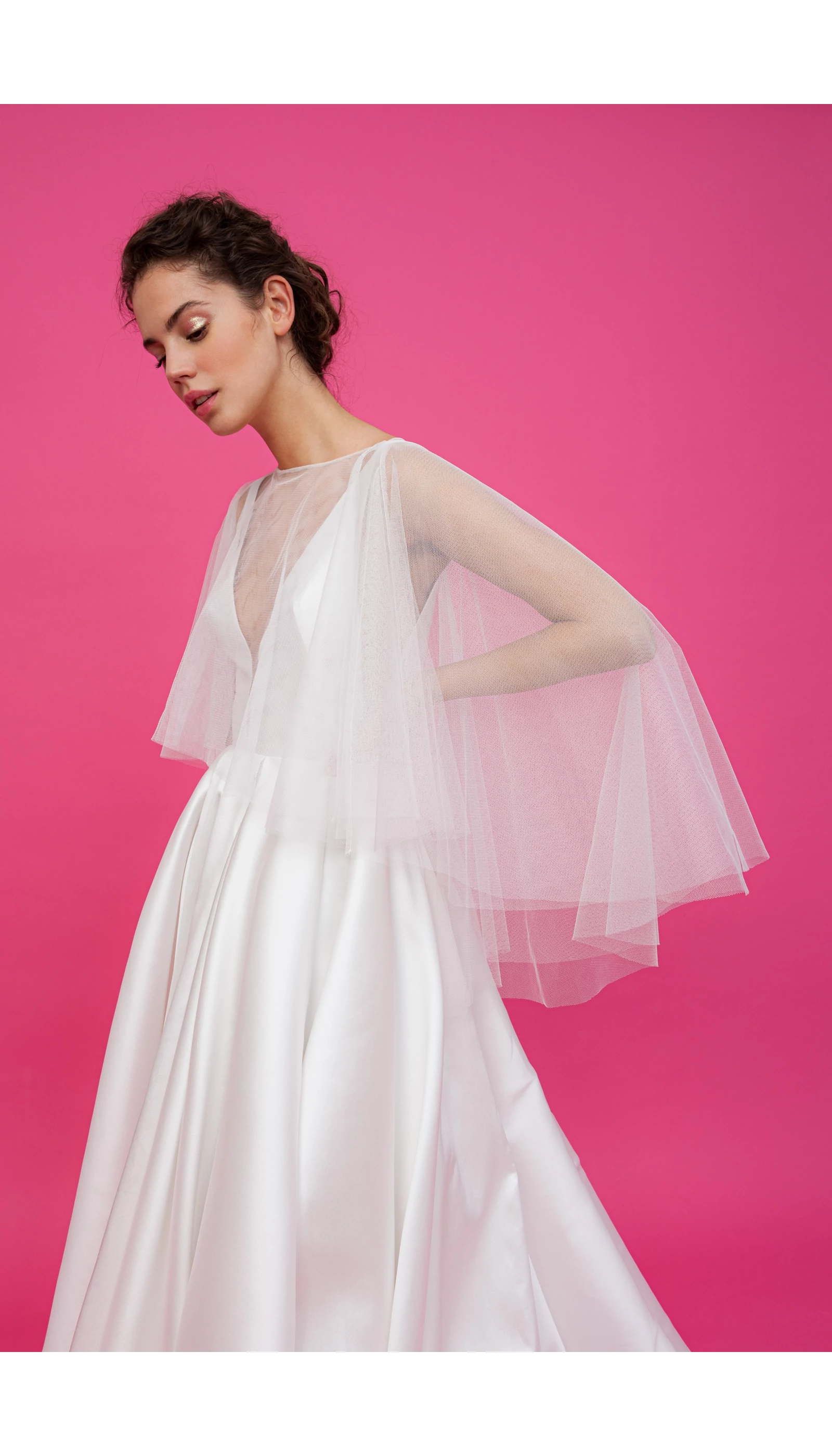 Ez a rövid puhatüll palást tökéletes megoldás lehet ha szeretnéd letisztult esküvői ruhádat egy modern kiegészítővel feldobni. Fátyol helyett is ideális mind a templomban, mind fotózáson vagy éppen hűvösebb időjárás esetén. Romantikus és előkelő megjelenést kölcsönöz viselőjének.