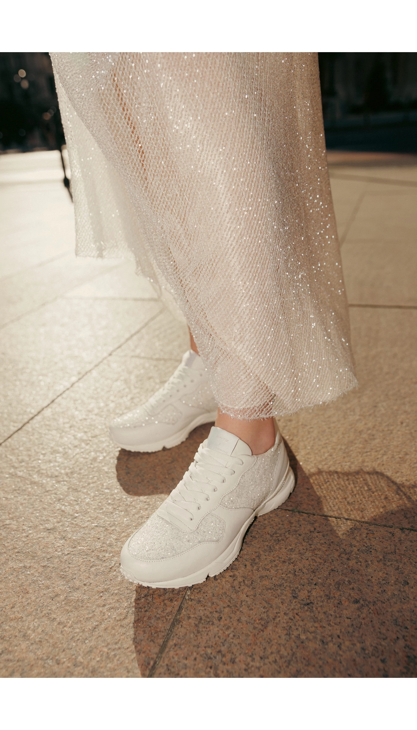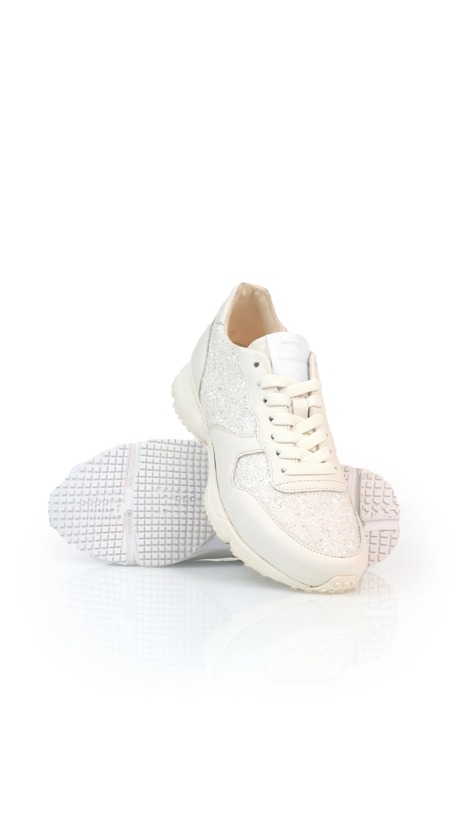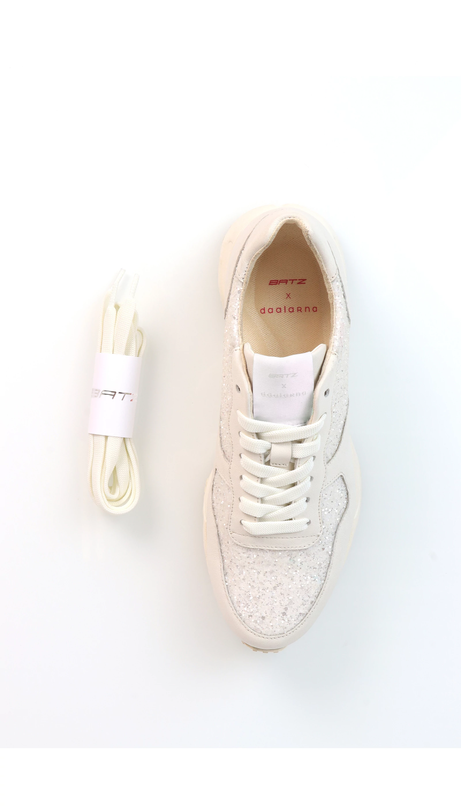 Kecses fazon, törtfehér árnyalatban, csillogós betétekkel. A cipő nyelvén a címke szatén, szövött textil címke, ezzel akartunk utalni a Daalarna ruhákban is használatos címkékre. A tervezésnél a fő szempontok közé tartozott, hogy olyan anyagok legyenek felhasználva a cipő kialakítása során, amelyek nem csak tartósak, de passzolnak akár egy törtfehér színű esküvői vagy alkalmi ruhához is.