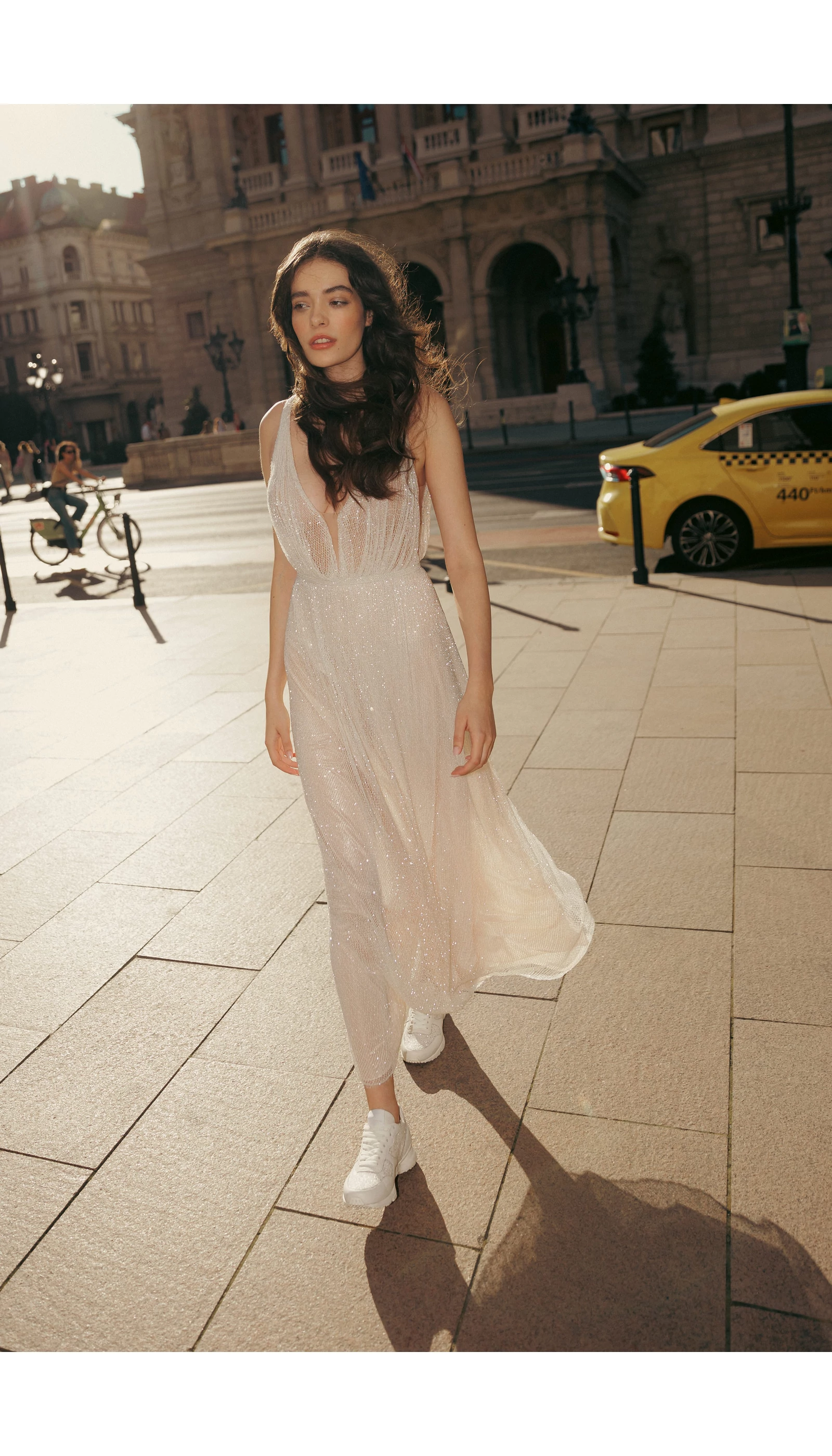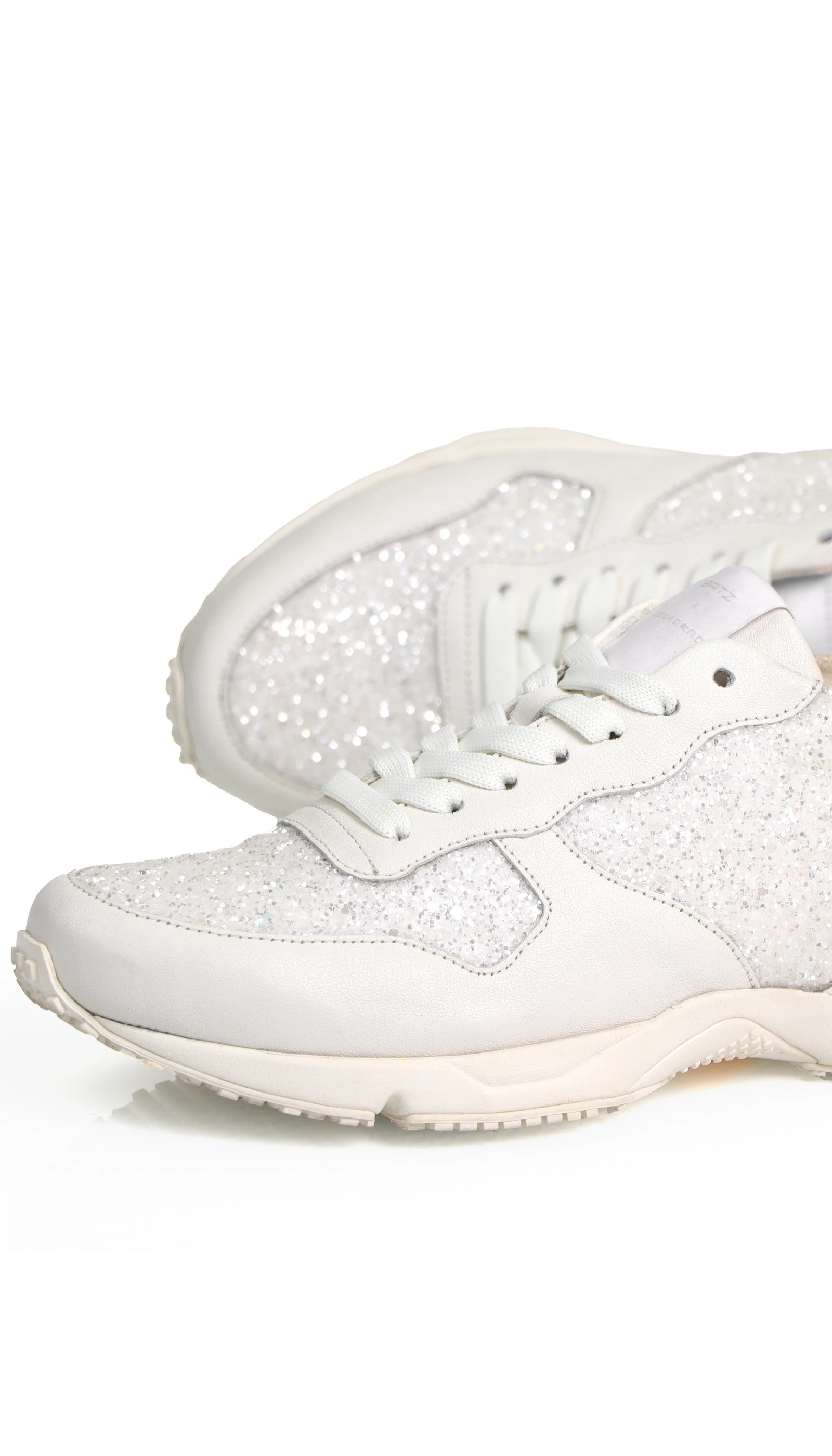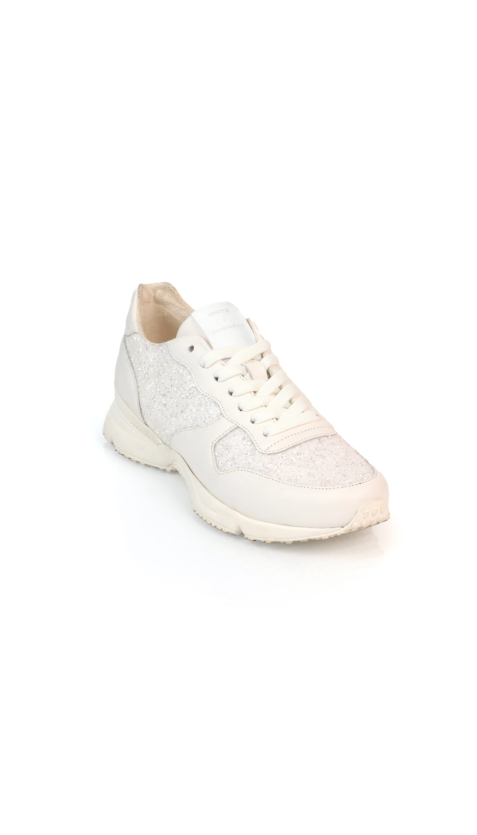 Kecses fazon, törtfehér árnyalatban, csillogós betétekkel. A cipő nyelvén a címke szatén, szövött textil címke, ezzel akartunk utalni a Daalarna ruhákban is használatos címkékre. A tervezésnél a fő szempontok közé tartozott, hogy olyan anyagok legyenek felhasználva a cipő kialakítása során, amelyek nem csak tartósak, de passzolnak akár egy törtfehér színű esküvői vagy alkalmi ruhához is.
